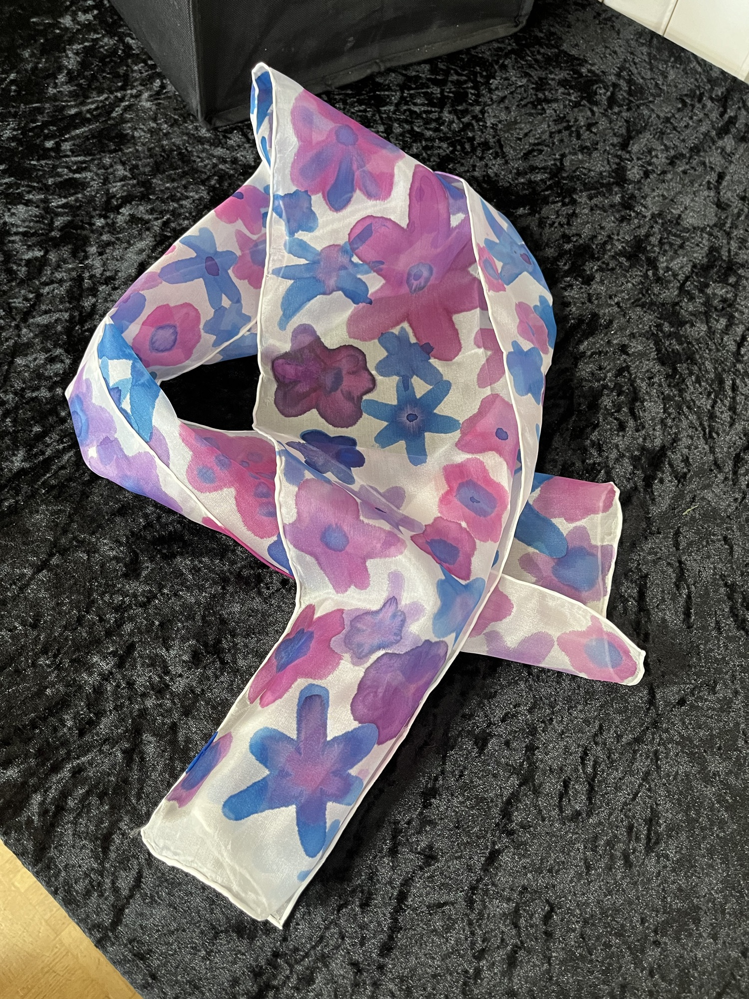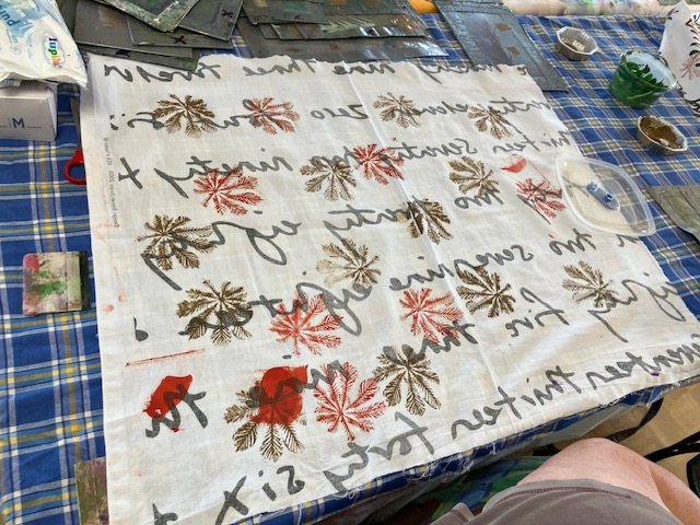 The highlight of the day was our collaborative project – a silk scarf painted by each member of our group under Sarah’s guidance. It was a delightful opportunity to explore our creativity together, resulting in a unique piece that one lucky member took home in our raffle.
