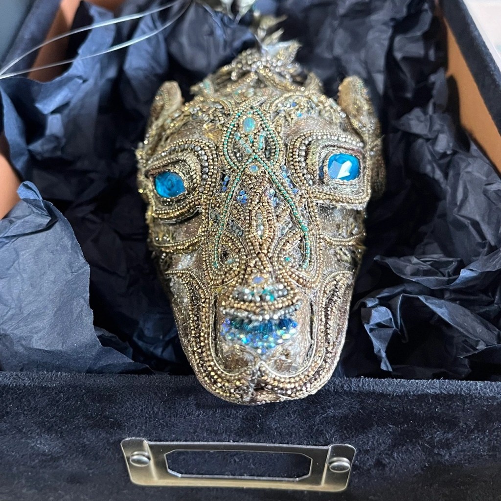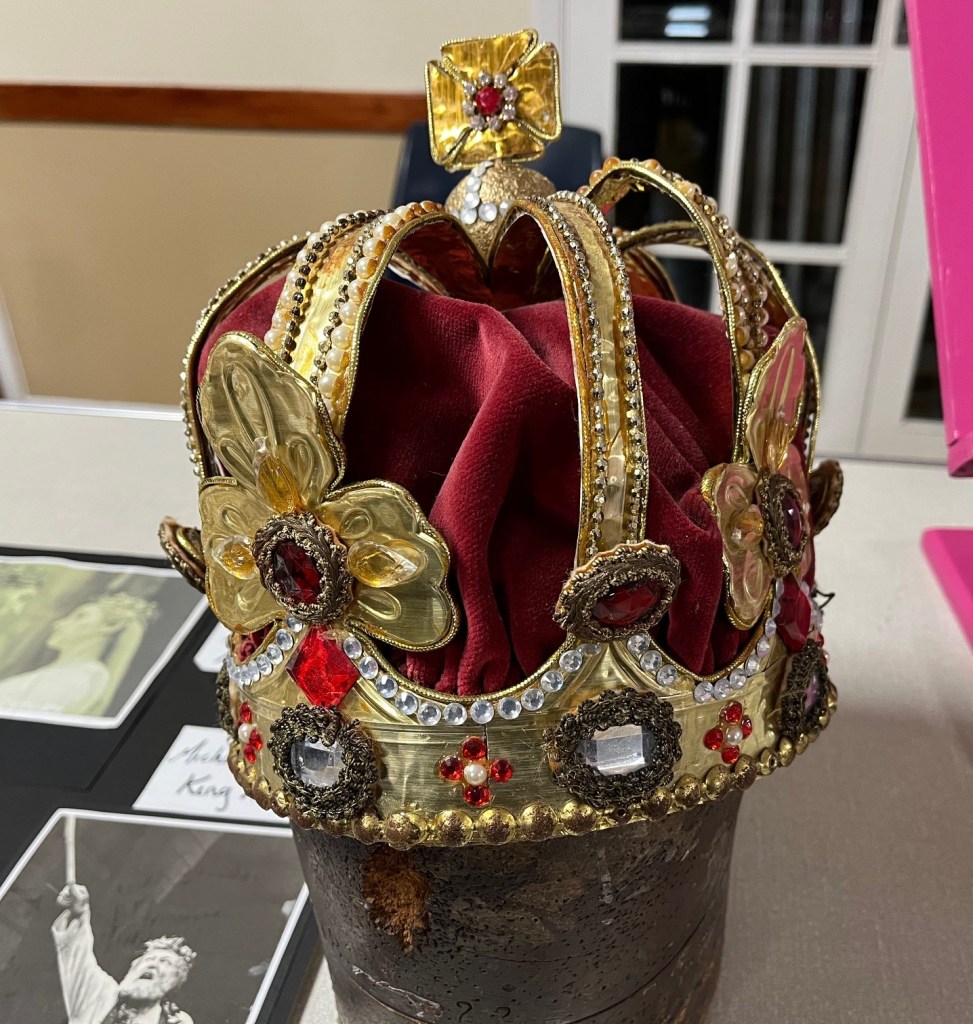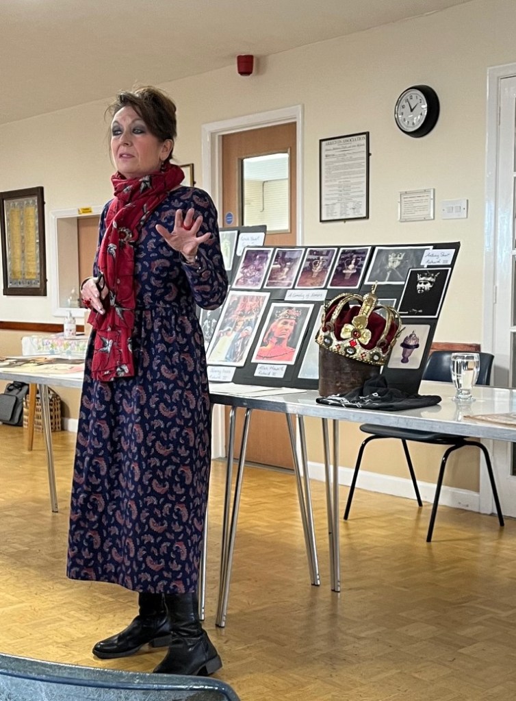 In January we were treated to an engaging and fascinating talk by Deborah Smythe, all about her time working with the Royal Shakespeare Company (RSC) at Stratford-Upon-Avon. Full of behind the curtain glimpses of what it meant to work as a milliner and jeweller for all the stage outfits, there were tales of famous actors, directors, even a special visit from the Queen. Sadly all the costumes Deborah created are kept and maintained by the RSC, so we could not see them in person, but there were plently of magazine and newspaper articles chronicling her time there. The crown was created for a school theatre production, from a very unusual base.